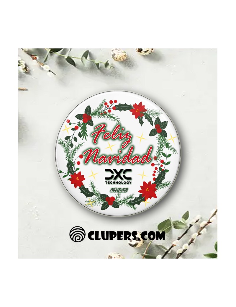 Clupers.com te ofrece las Chapas de Navidad Personalizadas Empresa color Blanco, un modelo de chapa divertida y personalizada con la frase Feliz Navidad, logotipo de la empresa o nombre de persona y la fecha del evento.