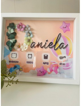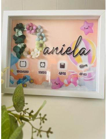 Elige un regalo practico y original, como este precioso marco blanco con la inicial del nombre del bebe, puede ser niño o niña, con flores y los detalles del nacimiento del bebe, sus fecha, medida, hora y peso.